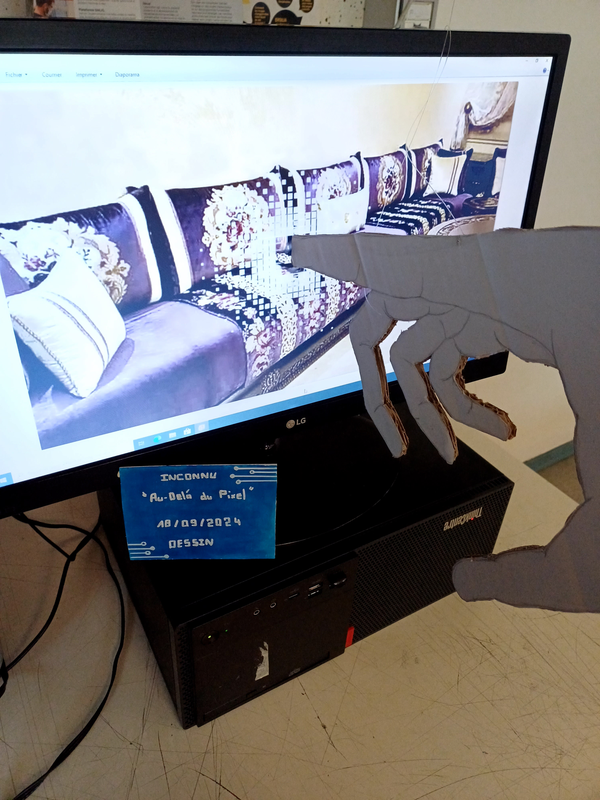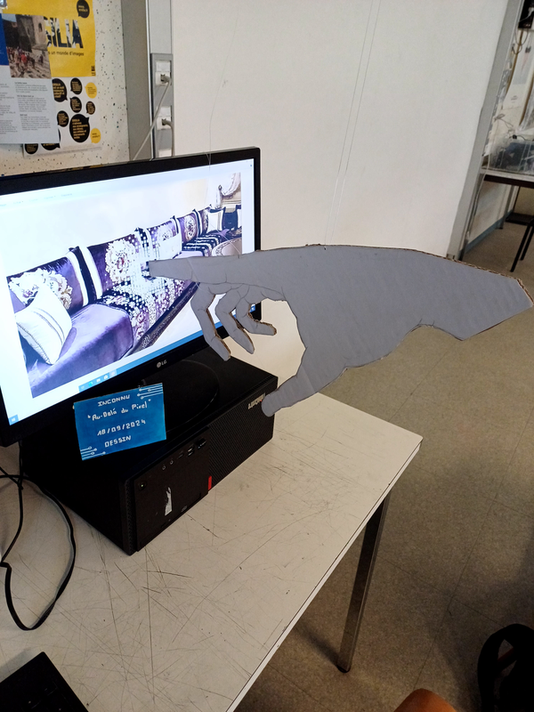 Pour répondre au sujet du portrait in situ j'ai choisi de faire une main dessinée puis la coller sur du carton et découpée. Cette main pointera du doigt l'écran où j'aurais mis l'image du salon de ma grand-mère car étant donné la distance entre moi et ma grand-mère ma tante et mes cousins nous avons l'habitude de correspondre par appel vidéo. Mon œuvre représenterait donc nos correspondance ainsi que mon envie de traverser l'écran pour pouvoir partager quelques moments avec eux.