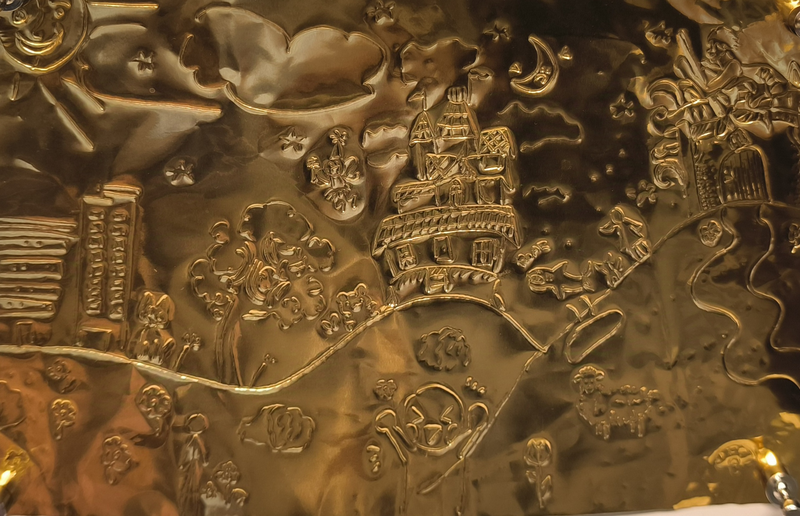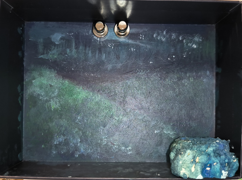 C'est une plaine de nuit avec des aurores boréales dans le ciel tout ça réalisé sur le fond de une boîte accompagné de un relief de buisson sur les bords.