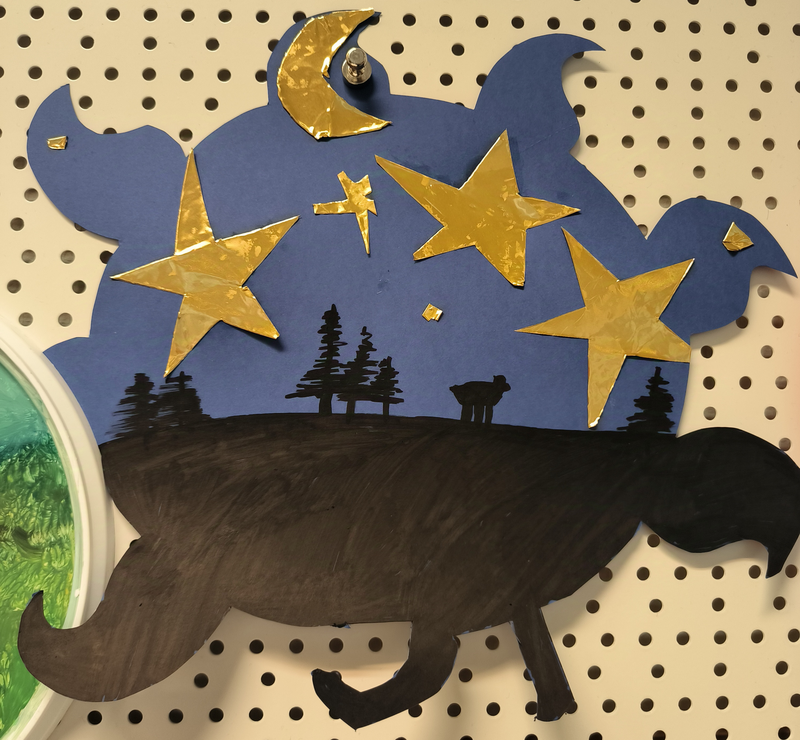 Un soleil comme forme de papier a l'intérieur un paysage avec une plaine dessiner en noir avec quelques arbres et un mouton avec de grandes étoiles dans le ciel accompagné de une demi lune.