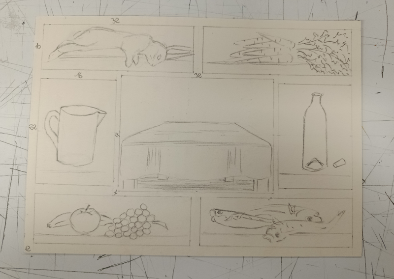 Utiliser un grand format avec un table peinte ou dessinée dessus, puis proposer aux primaires de faire les éléments de la nature morte (tels que des fruits, légumes, objets, etc..)