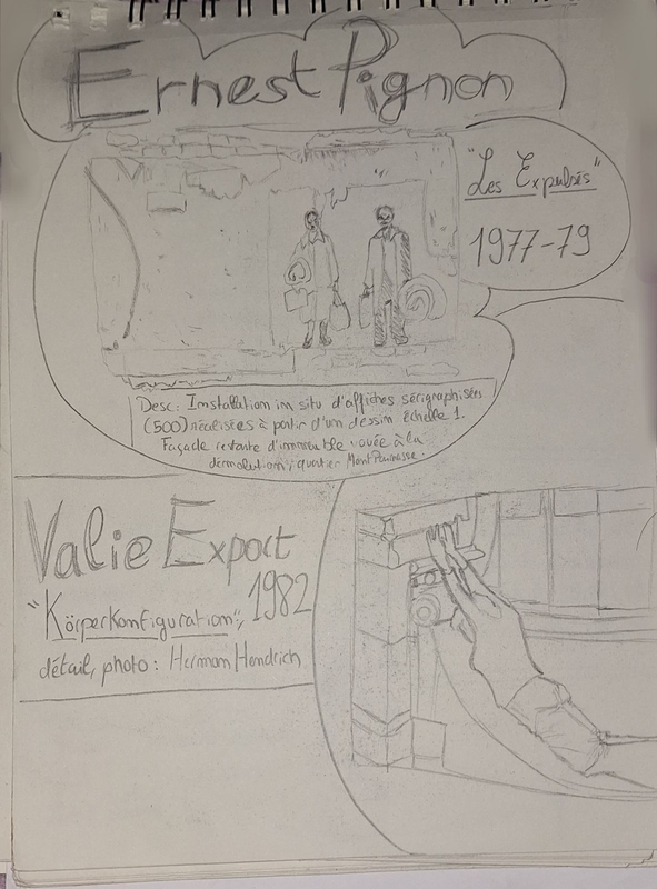 croquis de Valie Export, Körperkonfiguration et d'Ernest Pignon, Les expulsés