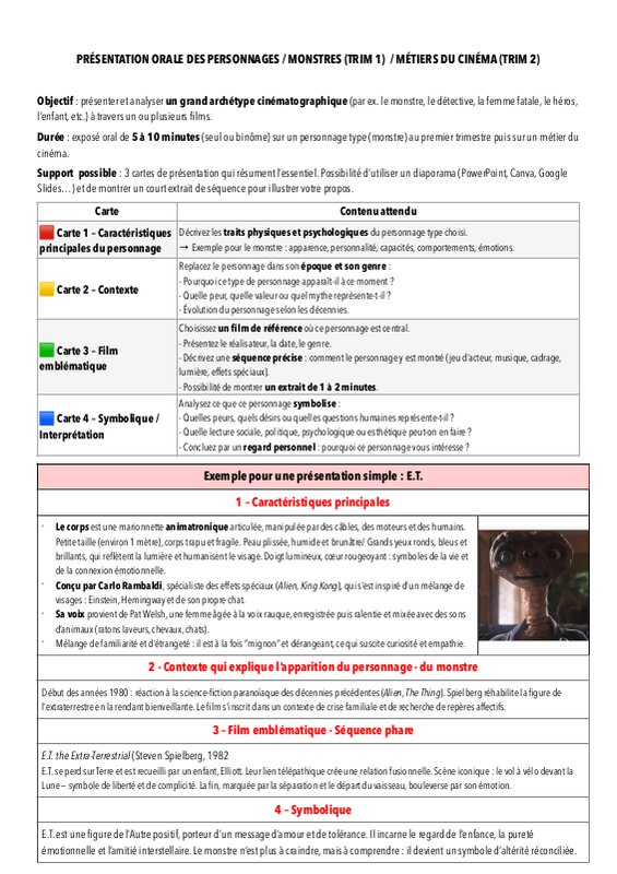 Oral – Personnages phares (monstres +) | /20 | Exposé oral (5 à 10 min) | Trim 1 |